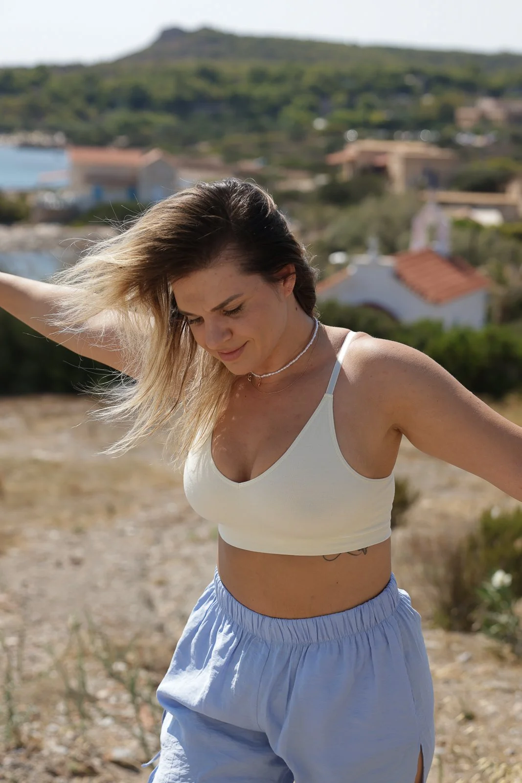 We hiked up to the ruins, following a steep path through the brush and up the cape. Here, as per our recent conversations, we shot some pieces as tops in an outfit rather than as swim or underwear. To reinforce in the imagery, a more expanded use. I would really like to get my hands on some Branwyn leggings or shorts for the future sets but as an alternative as we discussed, I am also keeping an eye out for some simple black leggings where the logo or style is not evident or can be removed.