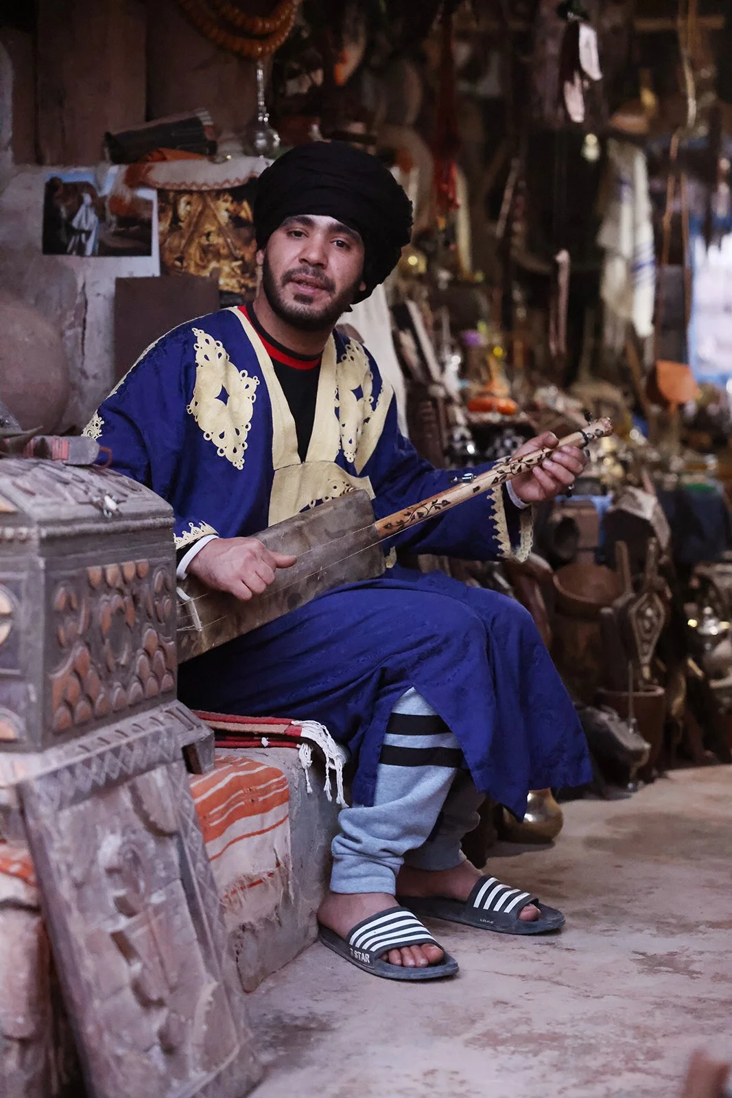 In the evening after our shoot, I bartered at a shop in the maze of steps leading up to the top of the village, to acquire a vintage silver powder horn from the mountains and an antique canteen from the desert that I searched out in the overflowing little shop of treasures. We shared tea and long conversation with the merchant, which resulted in him playing, and singing us a song, a moment I won’t forget, as night closed in around the ancient caravan stop.