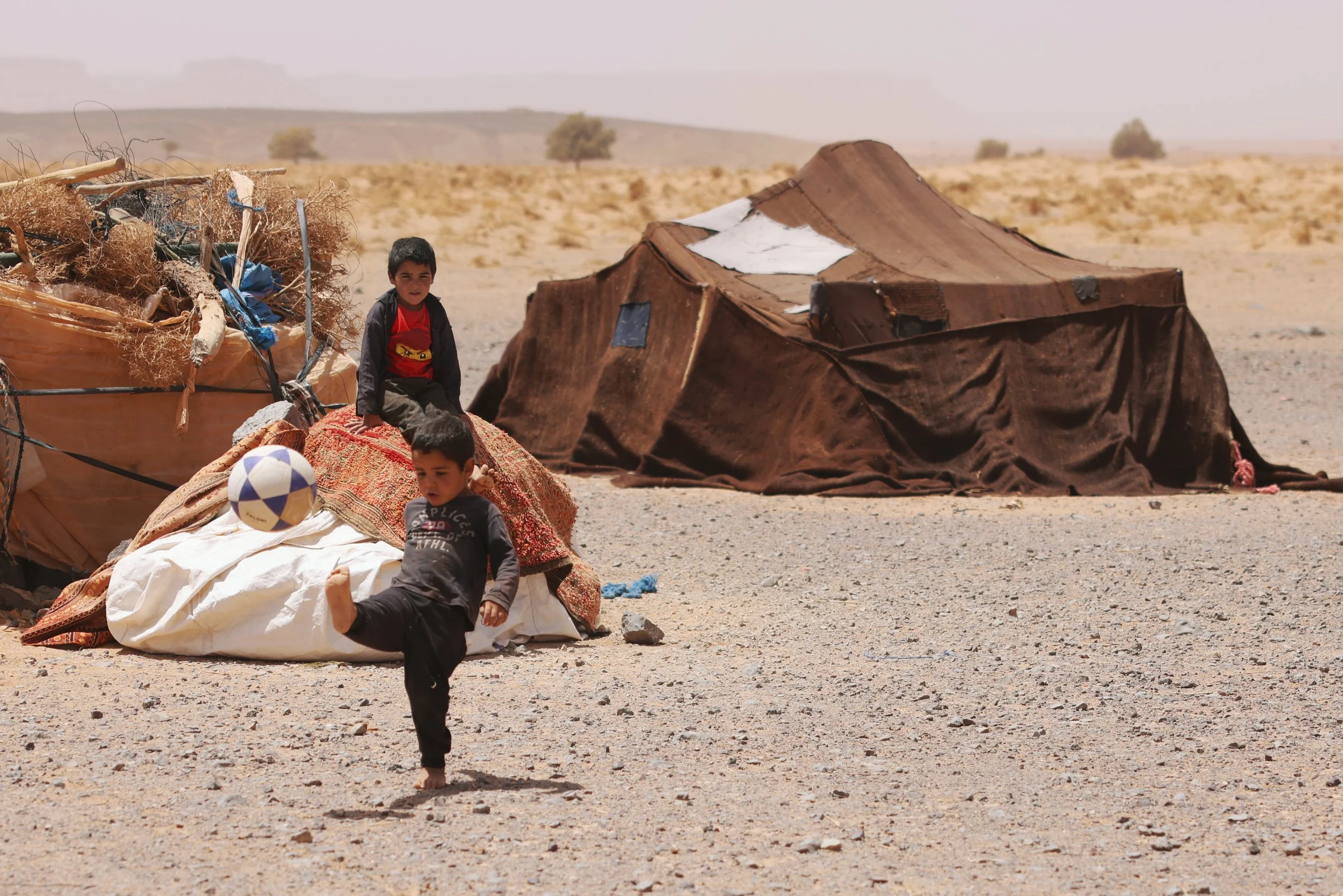 Twin nomad boys playing in front of their home. They don’t know their own age and they probably won’t go to school. Their mother was gone to get water from the well which is hours away by foot so we were not able to meet her. This lifestyle is a choice, preferred by persons who feel constricted by a static life and non tribal social strictures.