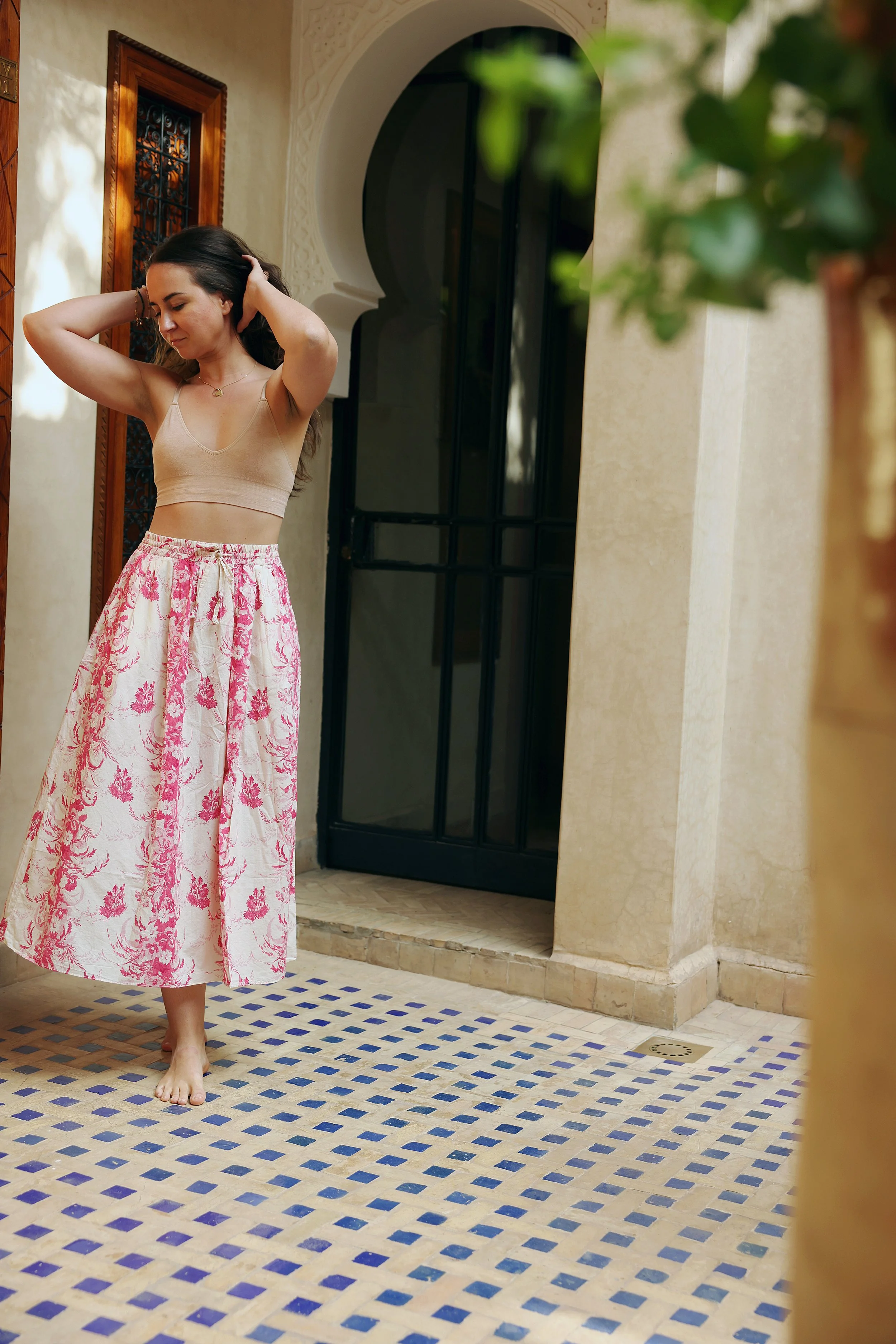 The next day after driving through the stunning High Atlas Mountains once more, we were back in the cool shade of our Riad at the heart of Marrakech, termed by locals the city of flies (for it’s buzzing motorbike traffic) and by tourists “The Red City” for it’s magical architecture. Hidden in our quiet oasis tucked into the bustling souks of the Medina, we washed off the last of the sands of the desert, microscopic particles seemed to have found their way into everything. We did the last photo session after a visit to the hammam, and that throughly steamed and scrubbed, fully relaxed contentment creeps into the imagery a bit I think.
