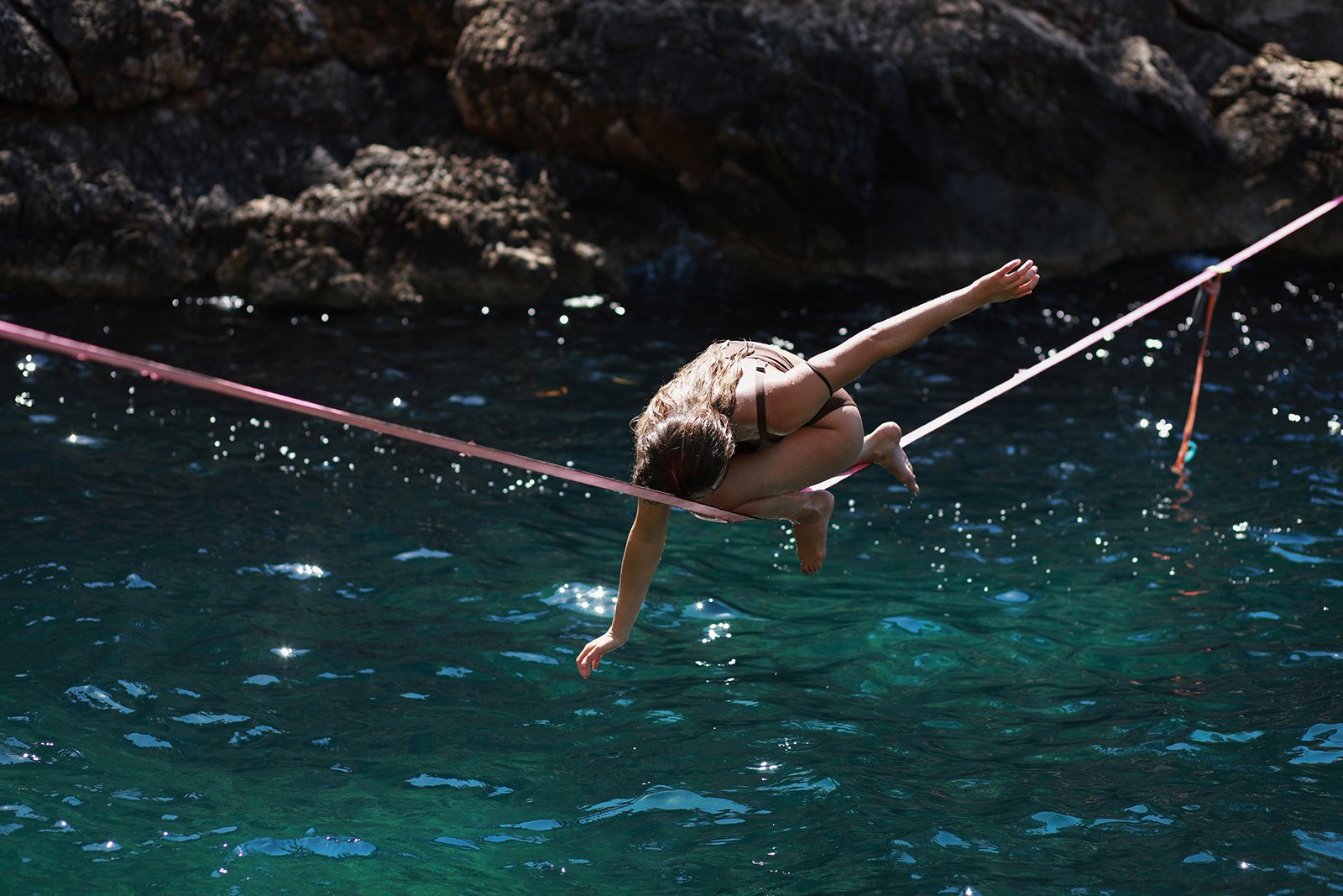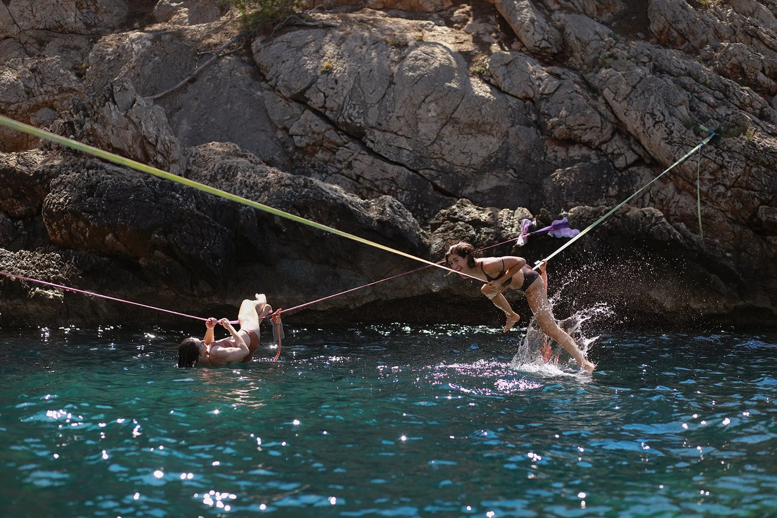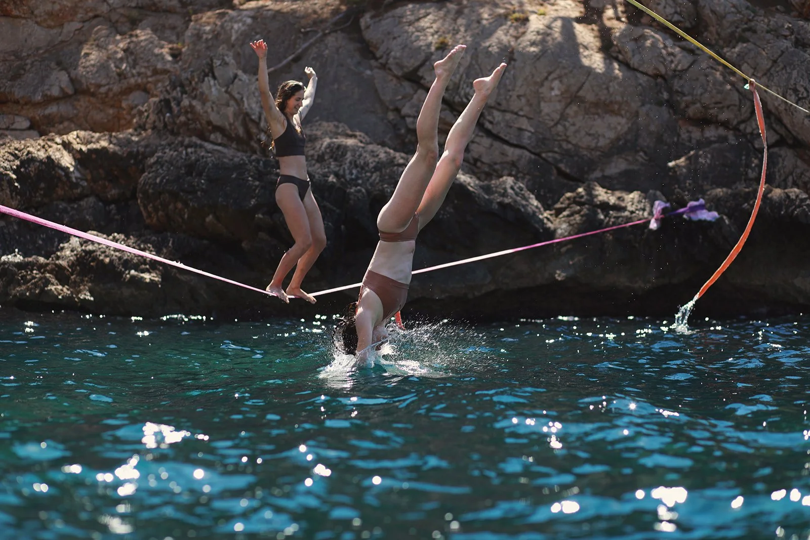 Bending, dipping and extending over the waters below, a fall means a cool refreshment from the Mediterranean sun but hauling themselves back on the line from the water is an intimidatingly demanding feat of upper body feat strength.